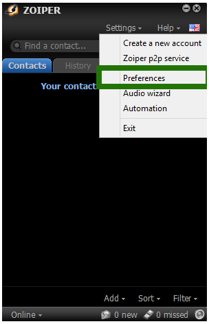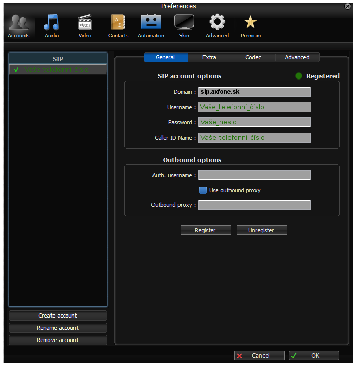 Po uložení nastavení se účest automaticky zaregistruje. Zaregistrovaný ZoIPer, vpravo je tlačítko "Registered"