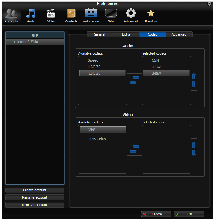 Upravte prioritu kodeků na: a-law, u-law, GSM.