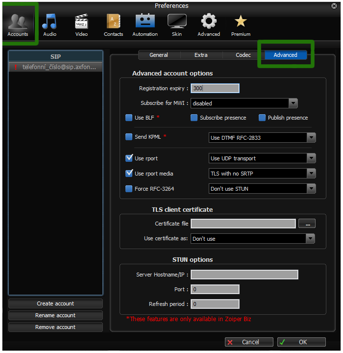 - Hodnotu "Registration expiry" upravte na 300 a zaškrtněte "Use rport", "Use rport media."