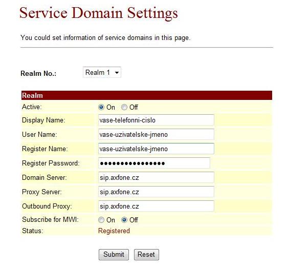 V oddíle SIP Setting / Service Domain nastavíte parametry pro připojení k Vašemu poskytovateli VoIP služeb: